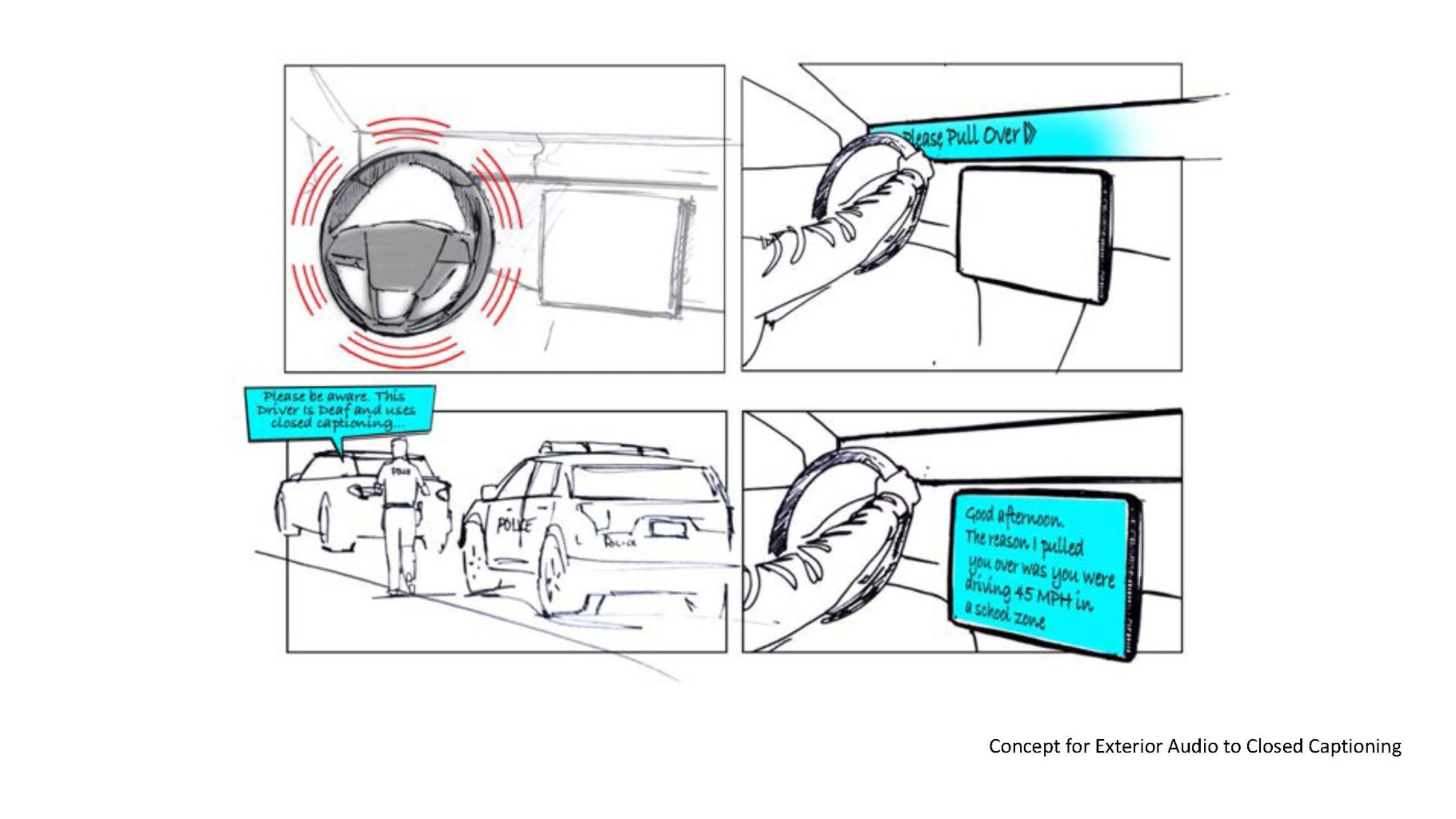 By reimagining how existing vehicle features could support my needs, I uncovered powerful accessibility opportunities already built into the platform. I explored using steering wheel and seat haptics as navigation cues, giving drivers clear directional feedback without relying on audio. I also leveraged the vehicle’s 11 cameras to support drivers and passengers who use American Sign Language, improving communication inside the cabin and during interactions like traffic stops and drive-thrus. With built-in microphones, we began testing whether the system could detect siren frequencies and surface emergency-vehicle awareness through visual and haptic alerts.